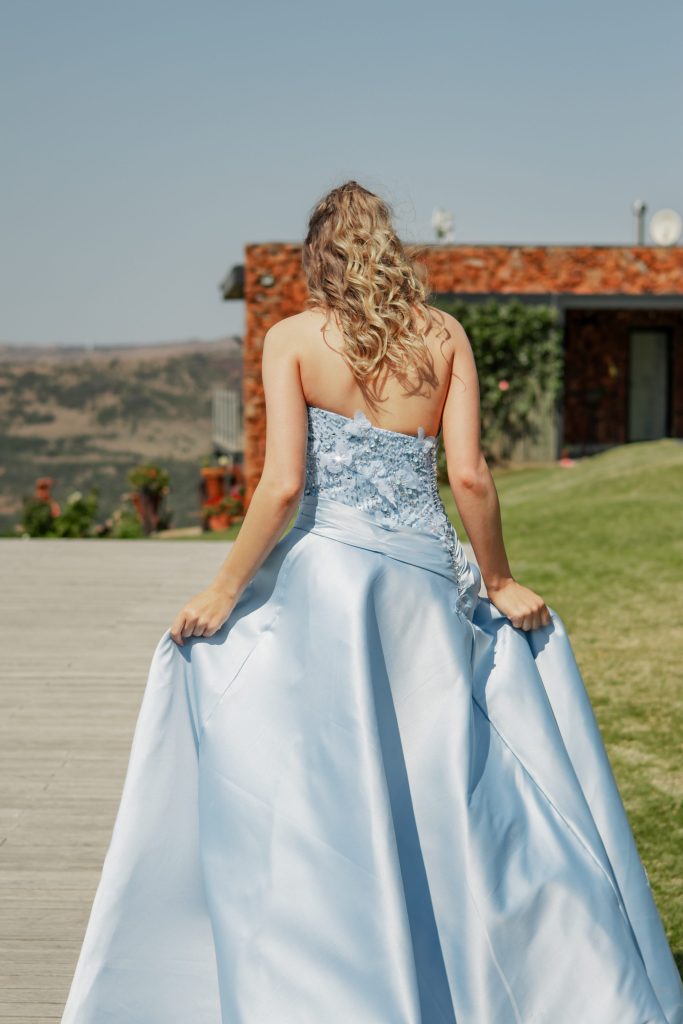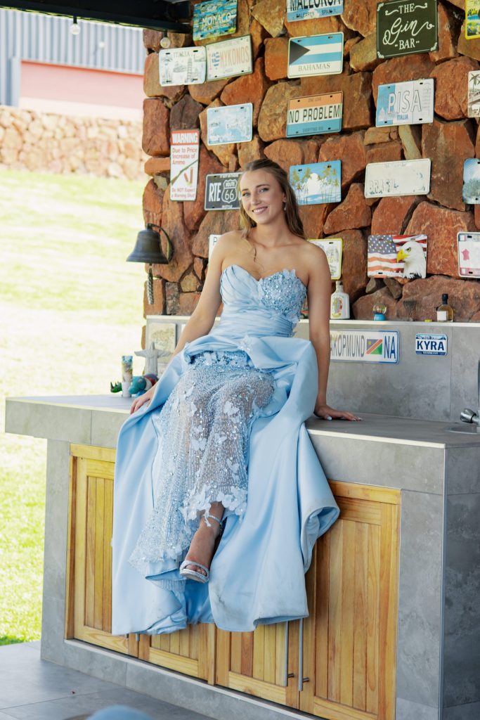 Van kleins af het ek geweet my matriekafskeidrok gaan blou wees. As kind het ek Cinderella oor en oor gekyk en altyd gewonder hoe daardie oomblik voel wanneer jy jou droomrok aantrek en net wéét: dit is jy. As ek blou dra, voel ek regtig soos my beste self, en hierdie rok gee vir my daardie selfde feëverhaal-oomblik. Die balrok-gevoel van agter, die fyner detail en sprankel voor, en natuurlik die vlindertjies. Die verskillende lae, teksture en detail simboliseer dat daar altyd meer is om in iemand te ontdek – hoe langer jy kyk, hoe meer sien jy.
