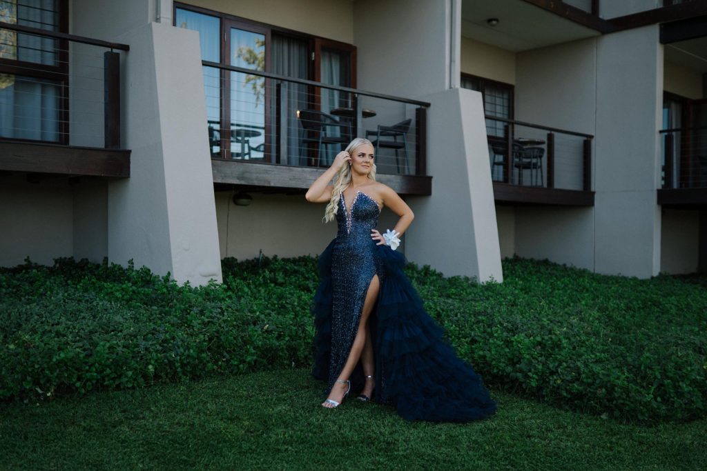 Deel van my inspirasie was om uniek te wees en iets te dra wat my persoonlikheid weerspieël. Ek wou hê my rok moes uitstaan, maar steeds elegant en stylvol lyk. Ek het gekies vir ’n donkerblou kleur omdat dit klassiek is, maar tog ’n bietjie van ’n koninklike gevoel gee. Die glans en besonderhede op die rok het vir my daardie “wow”-faktor gegee sonder om oordadig te wees. Die bo-deel van my rok is styfpassend en fyn versier met blink klipies wat lig vang en sprankel wanneer ek beweeg. Die diep V-neklyn met elegante steentjies gee dit ’n moderne en selfversekerde voorkoms, terwyl dit steeds baie stylvol bly. Die romp van die rok is een van my gunsteling dele — dit het ’n hoë skeur aan die voorkant wat ’n bietjie van ’n gewaagde, maar tog gesofistikeerde gevoel bring. Die agterkant bestaan uit lae donkerblou tule wat ’n pragtige, vloeiende sleep vorm. Dit gee die rok beweging en drama, en laat my voel asof ek oor ’n rooi tapyt stap.