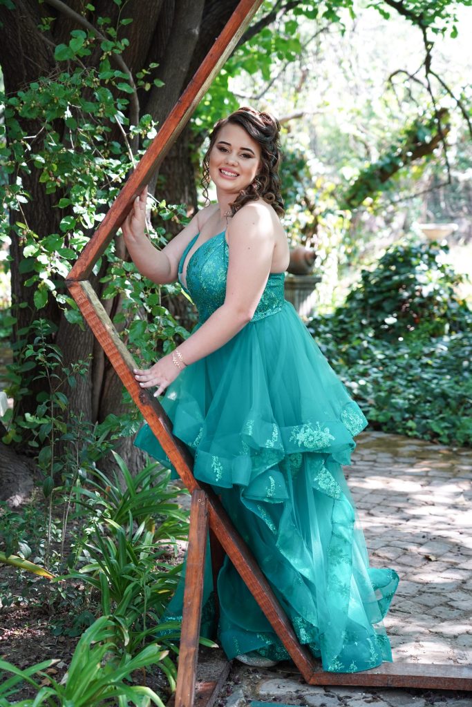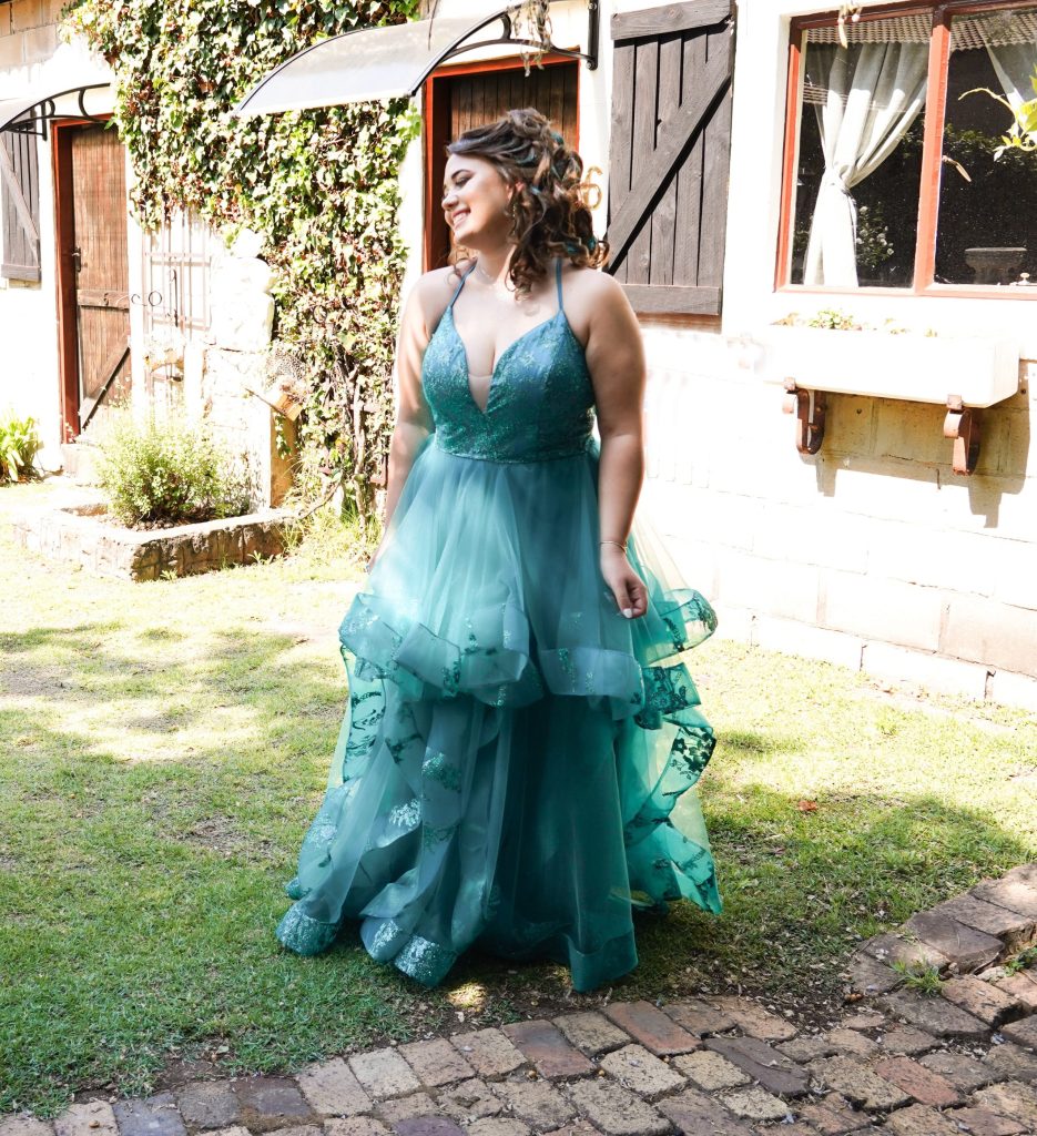 Die inspirasie agter my matriekafskeidrok kom van my liefde vir sagte,elegante kleure. Ek het die kleur van my rok gekies omdat dit my laat dink aan 'n pou se vere asook selfvertroue,en dit is iets wat ek wou uitstraal op hierdie spesiale aand. Die vloeiende materiaal simboliseer vryheid en beweging, terwyl die glinsterende detail 'n tikkie sprokiesmooi en drome voorspel. Ek wou hê my rok moet nie net mooi wees nie, maar ook iets sê oor wie ek is,sag, maar sterk. Die oop rug en sagte krulle in my hare het dit geheel afgerond met 'n vroulike gevoel. My doel was om soos 'n prinses te voel, maar steeds natuurlik te lyk en hierdie rok het dit presies vir my beteken.