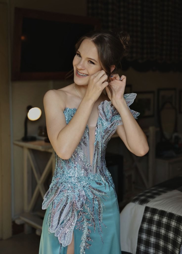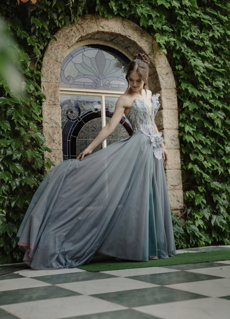 My rok beteken vir my meer as net iets mooi om aan te trek. Dit is ’n uitdrukking van my persoonlikheid en my liefde vir elegante kuns. Elke detail van die rok weerspieël wie ek is. Die sagte blougroen kleur met ‘n effense pienk, die glinsterende detail en die afhaalbare net stuk wys my liefde vir iets besonders – stylvol, maar steeds speels. As ek dit dra, voel dit asof ek uit ‘n droom wêreld gestap het.