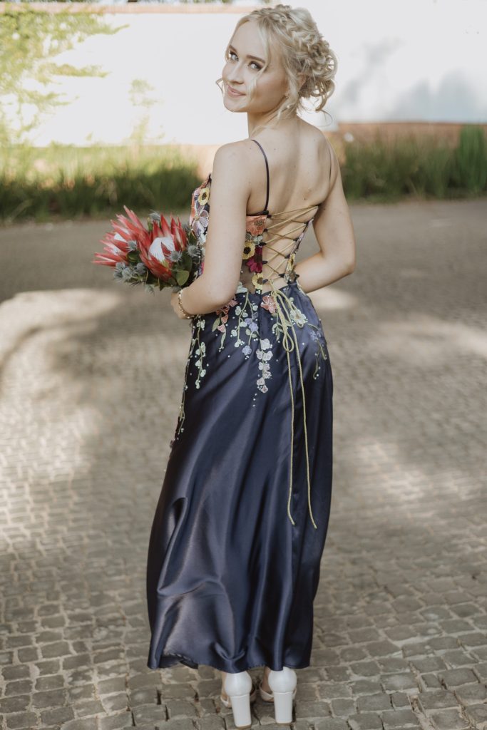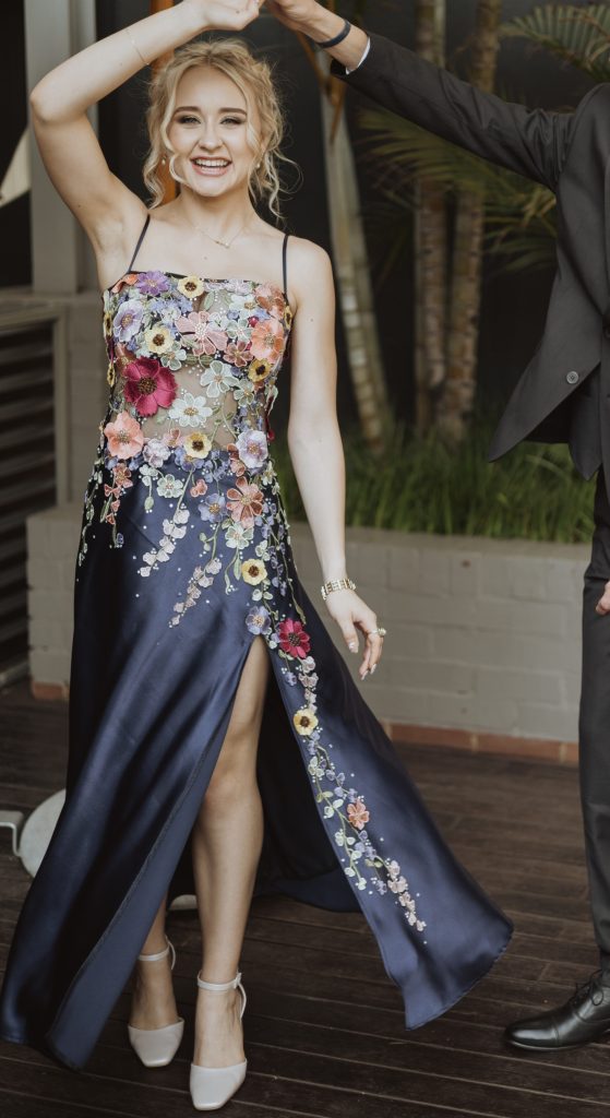 My matriekafskeidrok is vir my meer as net materiaal en mooi lyk: dis ’n simboliese afsluiting van ’n hoofstuk en ’n viering van wie ek geword het. Elke blom en steentjie vertel ’n storie van groei, vreugde en om jouself in volkleur te wees. Dit herinner my daaraan dat ek, nes die reënboog waarvan ek as kind gedroom het, uit baie kleure bestaan, elkeen gevorm deur mense oor my skoolloopbaan, geloof en dankbaarheid. Vir my is hierdie rok dus nie net vir een aand gemaak nie, maar vir ’n herinnering wat ek vir altyd dra: om altyd met kleur, lig en oortuiging deur die lewe te beweeg
