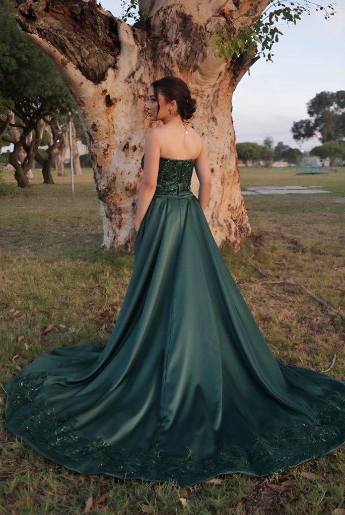 The inspiration was to bring to life a timeless and elegant gown that reflected both sophistication and individuality. Together with Miss Alison, we incorporated a few refined changes to make it uniquely mine. The train was extended to create a more graceful and dramatic silhouette. I chose the colour emerald green, as it complemented my eyes and represents my birthstone, a symbol of elegance, renewal, and inner strength.