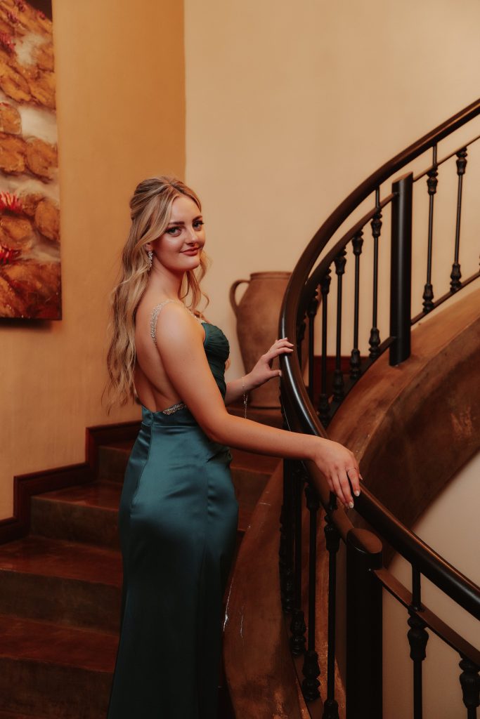 Ek is geïnspireer deur ’n elegante, tydlose styl met ’n moderne twist. Ek wou iets hê wat vroulik en sag lyk, maar steeds selfvertroue en klas uitstraal. Die kleur en snit herinner my aan iets wat jy in ’n romantiese film sou sien. Ek het die rok gekies omdat die kleur vir my spesiaal is, dit laat my oë uitstaan en pas perfek by my styl. Ek hou van hoe elegant en tydloos die snit is,dit voel gemaklik en natuurlik. Die glansdetail gee net daai ekstra bietjie sprankel sonder om oordoen te wees.